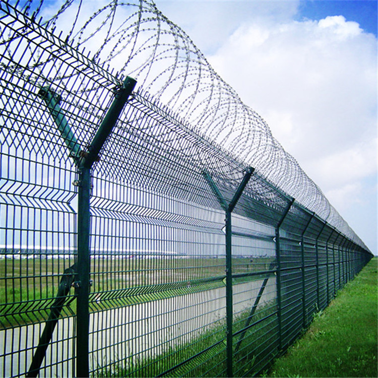 “Y型安全防護護網”,由Y型支架立拄,加強型焊接片網,安全防盜銜接件和熱鍍鋅刀片剌網構成,是強度和安全防護性級別很高的圍界護欄網商品。被廣泛應用在機場、軍事基地等高安全場所。這種圍界的杰出特色即是漂亮有用、安全性高、防攀爬才能好,網體銜接方法選用特制SBS緊扣件,有用避免人為的破壞性拆卸,橫向四道折彎加強筋,使網面強度明顯添加。