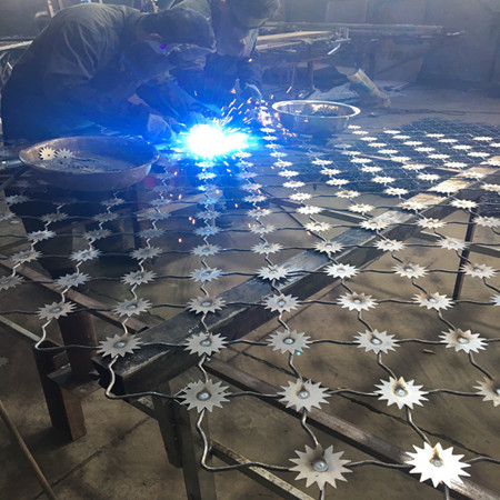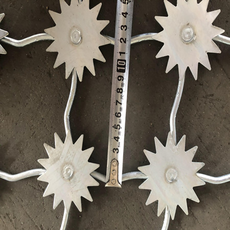 1、梅花刺片:梅花剌片直徑不小于7.5cm (直徑6cm、7cm、8cm) ,刺片厚1.5mm ,采.用Q235低碳鋼板沖壓成型。梅花刺片用氬弧焊將梅花形刺片焊接在美格網(wǎng)的節(jié)點(diǎn)上,形成刺形保護(hù),有效的防止了手握腳攀。
