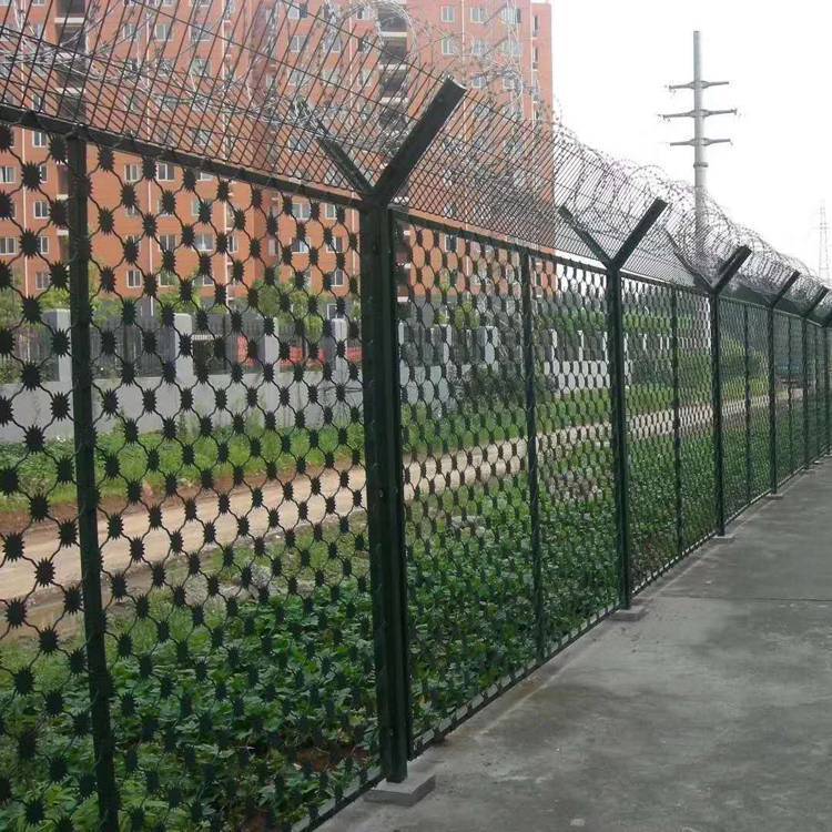 梅花刺網(wǎng)又稱監(jiān)獄護欄網(wǎng)或監(jiān)獄隔離柵,主要是采用高強度的刀片刺網(wǎng).與普通防護網(wǎng)的結(jié)合,由V型支架立柱,加強型焊接片網(wǎng),安全防盜連接件和刀片刺網(wǎng)組成.刀片刺網(wǎng)是一種新型防護網(wǎng),由銳利尖角鍍鋅鋼板或不銹鋼薄板做刀片,鋼絲做芯線組合而成的防護器材梅花刺網(wǎng)又稱高安全防護網(wǎng)、監(jiān)獄防護網(wǎng),是用氬弧焊將梅花形刺片焊接在美格網(wǎng)的節(jié)點上,形成刺形保護,有效的防止了手握腳攀,為此該鋼網(wǎng)墻在監(jiān)獄或看守所使用。