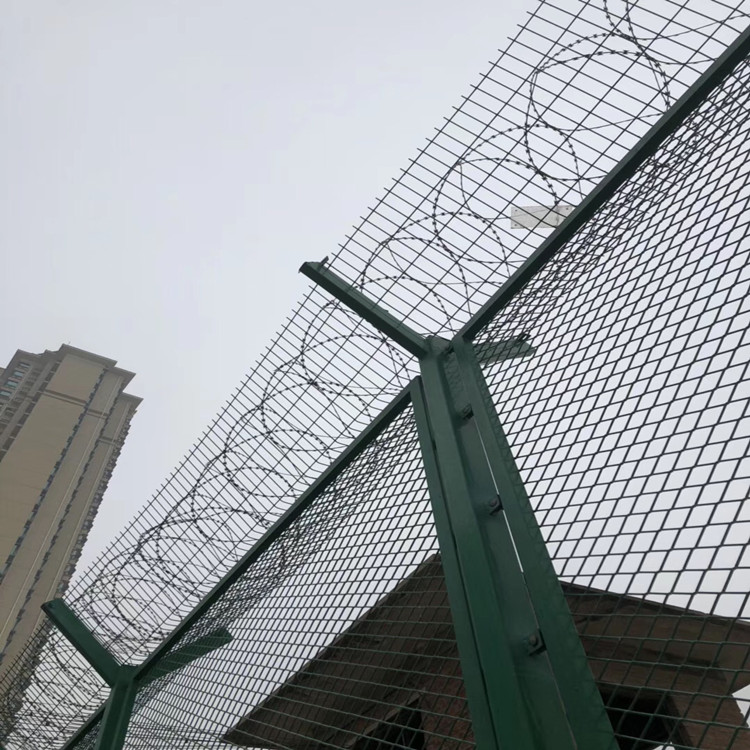 4、211型邊境鐵絲網,鐵絲網的結構是下面兩道上面依次跺起來一道,從下到上總共是3道鐵絲網。接下來我們詳細說明一下211邊境鐵絲網,此結構的鐵絲網最下面兩道采用直徑是90公分的刀片刺網之后上面在放一道直徑90公分的刀片刺網,最上面安裝一道直徑是60公分的刀片刺網。架設的立柱類似干字型支架,架設立柱高2.4米,立柱采用Q235材質50*50*2mm方管,柱高2.4m; 橫向支架采用40*40*3.5mm角鐵,橫向支撐3道,表面處理浸塑防腐處理、墨綠色。